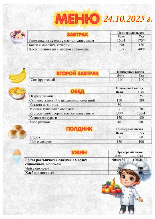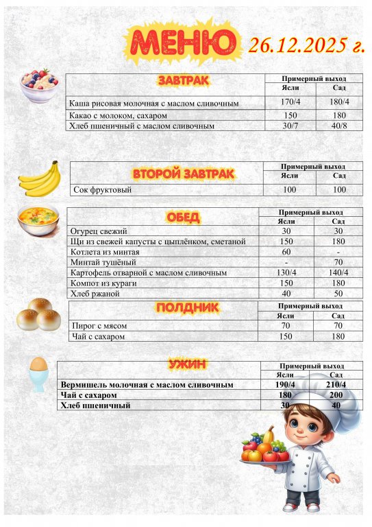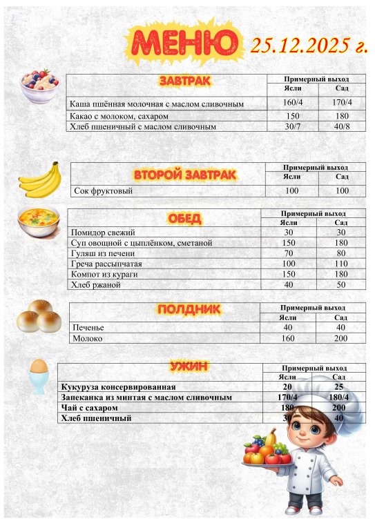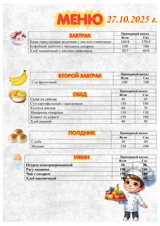 Основное меню приготавливаемых блюд в МБДОУ "Детский сад № 166