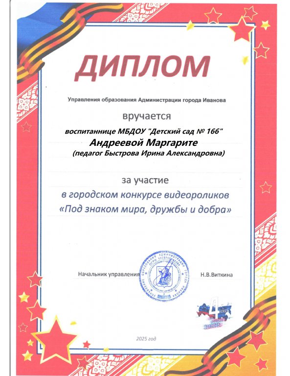 Цель конкурса — познакомить детей с традициями и культурой страны и города, а также воспитать чувство патриотизма, уважение к мужеству и самоотверженности защитников Родины. Воспитанница группы "Капелька" Маргарита Андреева вместе с педагогом Ириной Александровной Быстровой представили на суд жюри ролик в номинации "Герой среди нас". В нем Маргарита рассказала о своем папе.