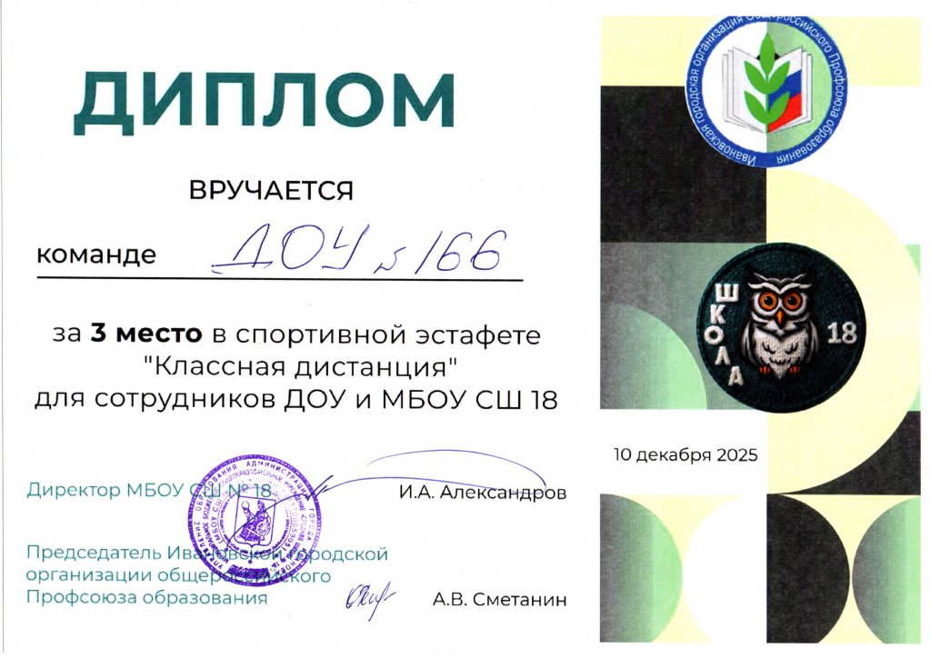 10 декабря 2025 года на базе МБОУ СШ № 18 прошёл спортивный праздник «Классная дистанция». В нём приняли участие учителя школы № 18 и воспитатели детских садов нашего округа: № 79, 166, 167. Жюри представляли: директор МБОУ СШ № 18 Александров Иван Анатольевич и ведуий специалист дошкольного отдела Якупова Наталья Александровна.