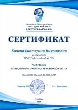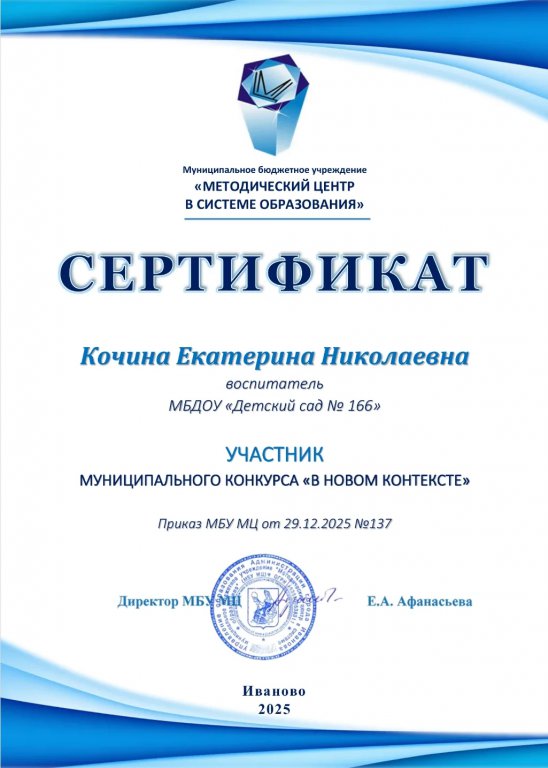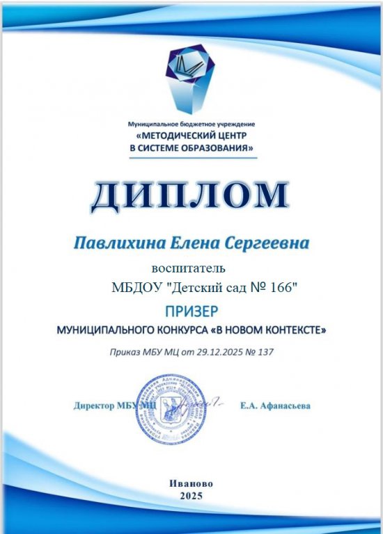 Вот и подведены итоги муниципального конкурса конспектов для педагогов под названием «В НОВОМ КОНТЕКСТЕ». Наш детский сад представляли педагоги: Павлихина Елена Сергеевна, Быстрова Ирина Александровна и Кочина Екатерина Николаевна.
