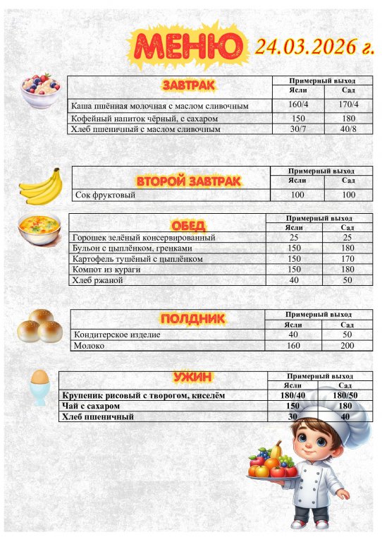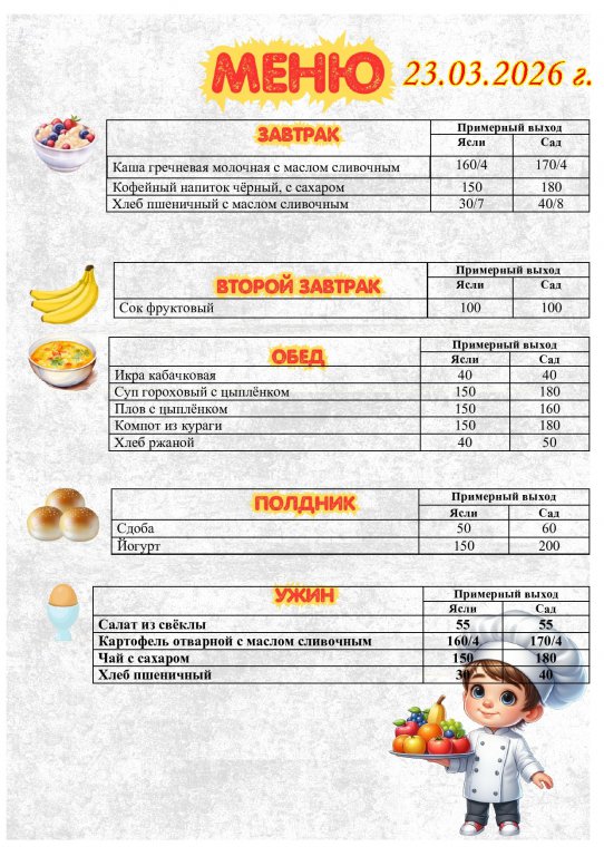 Основное меню приготавливаемых блюд в МБДОУ "Детский сад № 166